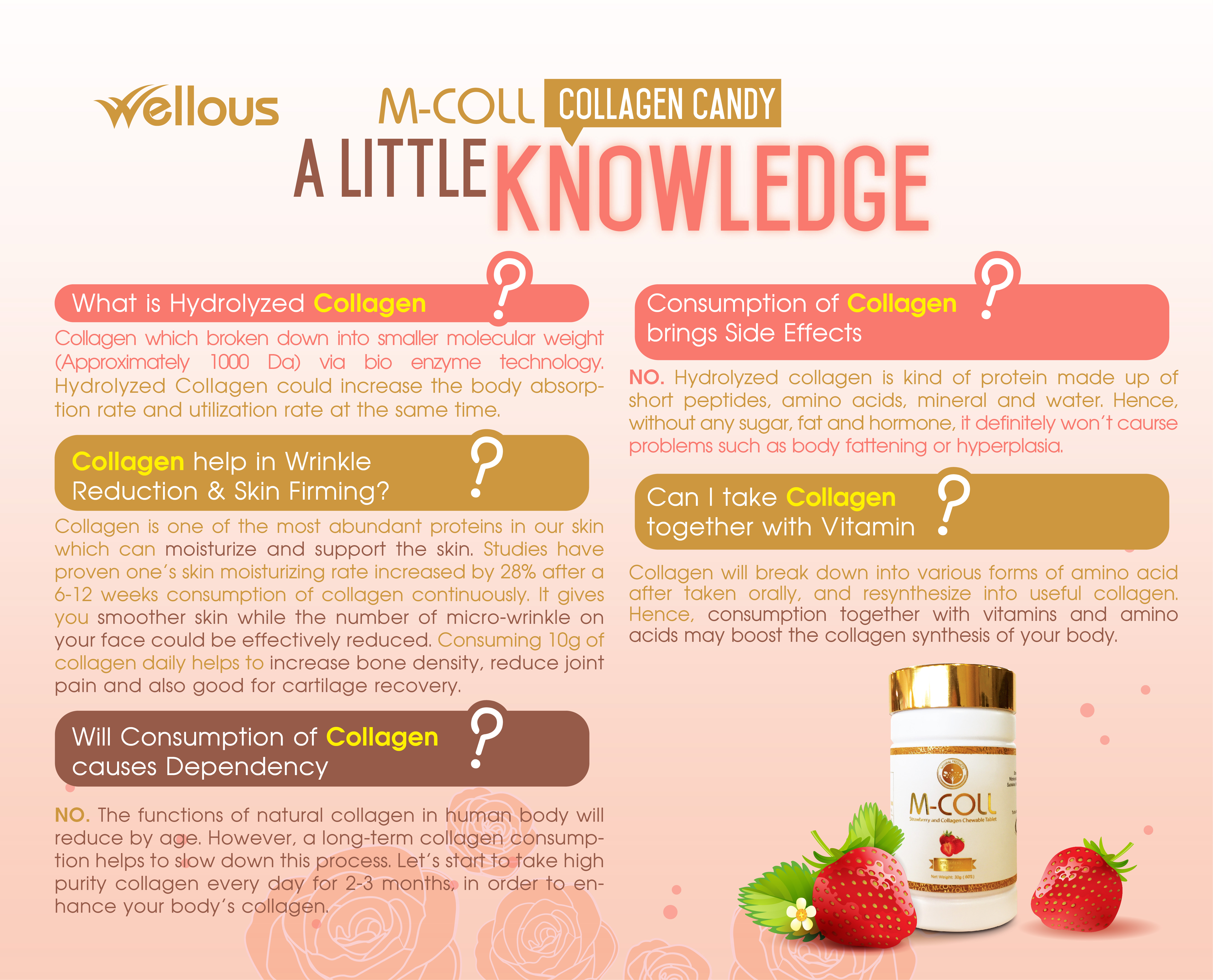 Fish collagen, strawberry powder, grape powder, orange powder, wheat flakes, maltodextrin, microcrystalline cellulose, sucralose, magnesium stearate, silicon dioxide